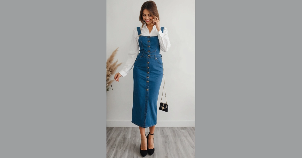 Okay, let’s talk about this *denim outfit*! This isn’t your grandma’s denim (unless your grandma is secretly super hip, then maybe). This awesome overall dress paired with a crisp white shirt is basically screaming, “I’m stylish, but I also know how to have a good time!” It’s like denim got a major glow-up and decided to show everyone it’s not just for messy art class or chilling on the couch anymore. Seriously, that full button-down front? Chef’s kiss for detail!