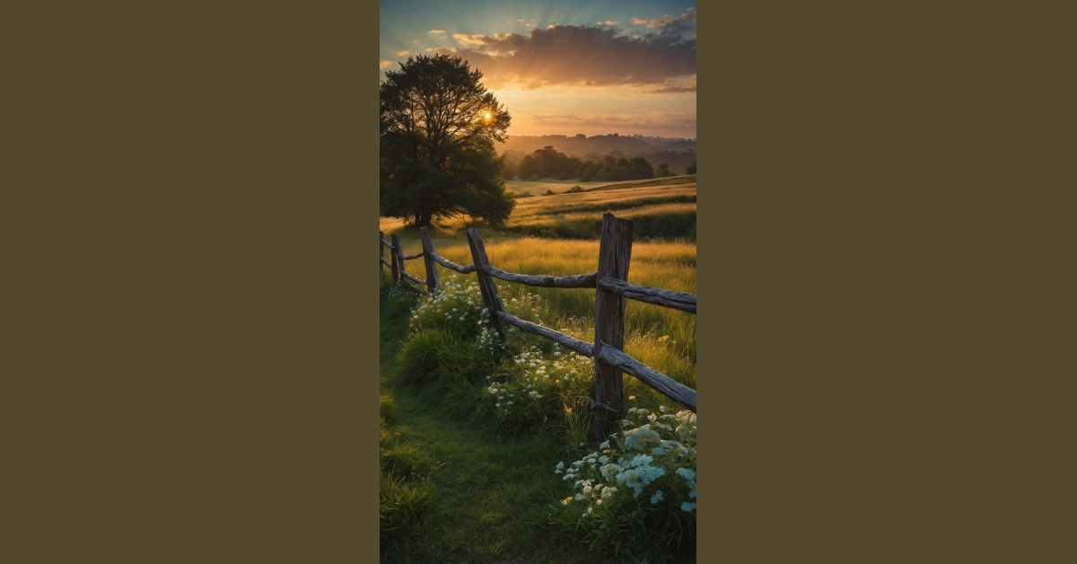 And check out that super rustic fence, casually hanging out with those cute little white flowers. It’s like they’re having their own little garden party, totally ignoring the drama of the sun setting (or rising!). This isn’t just a picture; it’s practically an open invitation to ditch your homework and wander through those sun-kissed fields. You can almost smell the fresh air and hear the quiet hum of nature – probably just the wind, but let’s pretend it’s the field whispering, “Come on in, the dream’s fine!” Who knew a fence could look this inviting? It’s definitely giving “main character energy” in the world of dreamy landscapes!