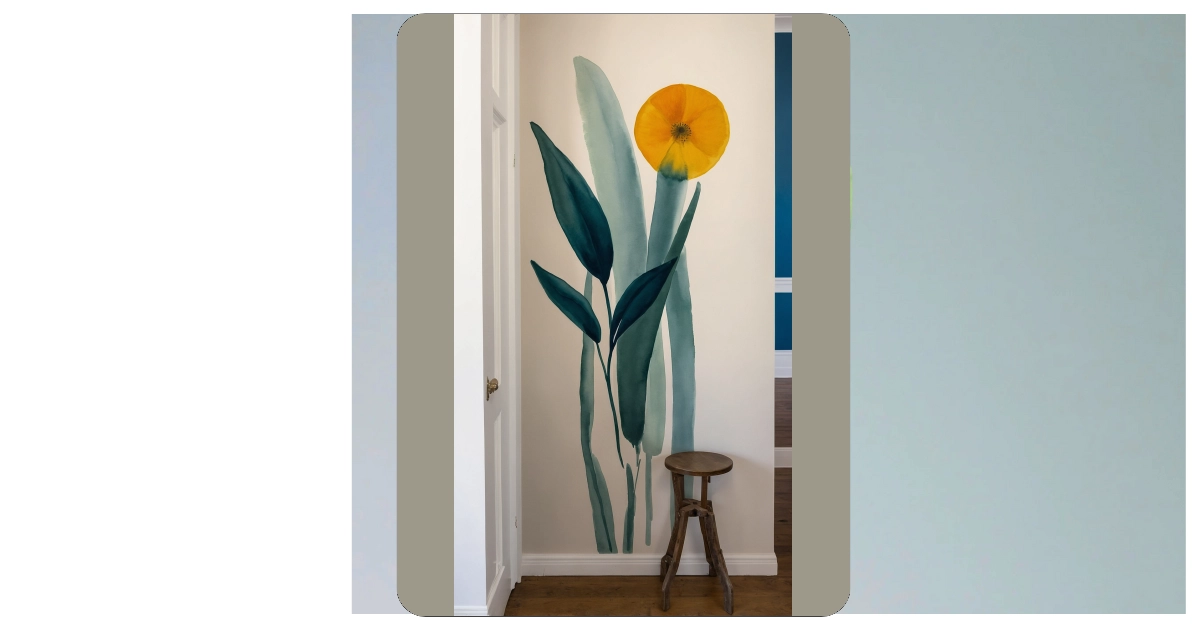 Seriously, who needs a window when you’ve got a giant, sunny yellow flower bursting on your wall? It’s like someone bottled up a perfect summer day and splashed it right here. The deep green leaves give it that cool, fresh vibe, making you almost feel a breeze. This isn’t just paint; it’s a mood-lifter, transforming what could be a super plain hallway into a vibrant, artistic statement. It even makes that little wooden stool look like it’s waiting for a painter to take a well-deserved break after creating this awesome, wall-sized masterpiece!