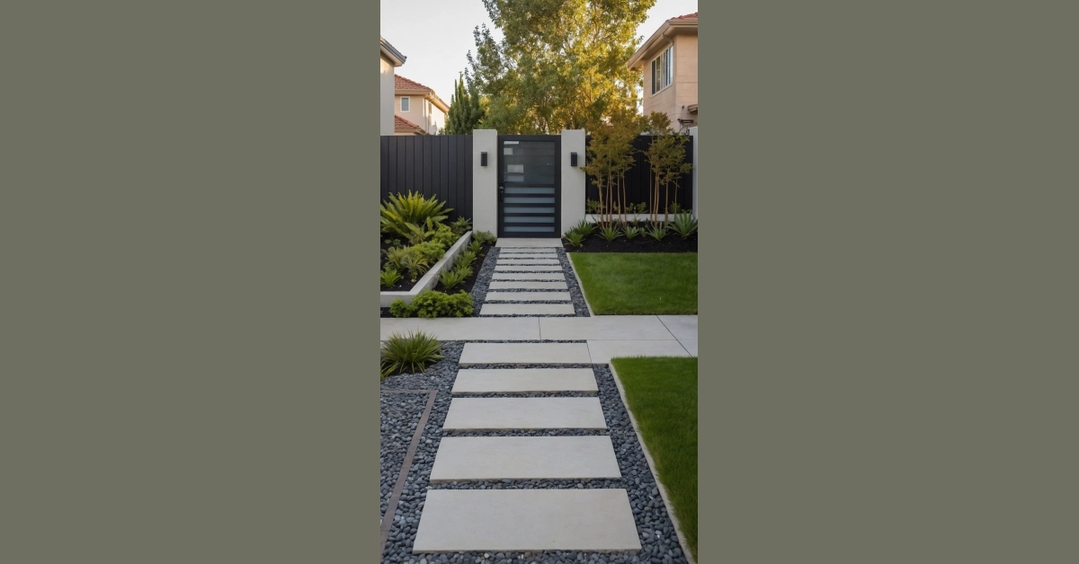 Forget the usual boring sidewalk, this front yard landscaping has definitely leveled up! Just look at those super cool, floating-looking stepping stones – they’re practically begging you to play a giant game of hopscotch all the way to the front door. But be warned, those sleek dark pebbles around them aren’t for skipping on; they’re probably there to make sure you pay attention and don’t track mud into this super modern paradise. It’s so perfectly put together, you’d almost feel bad letting a stray leaf mess up the vibe, like you’ve just stepped into an architectural magazine instead of someone’s house!