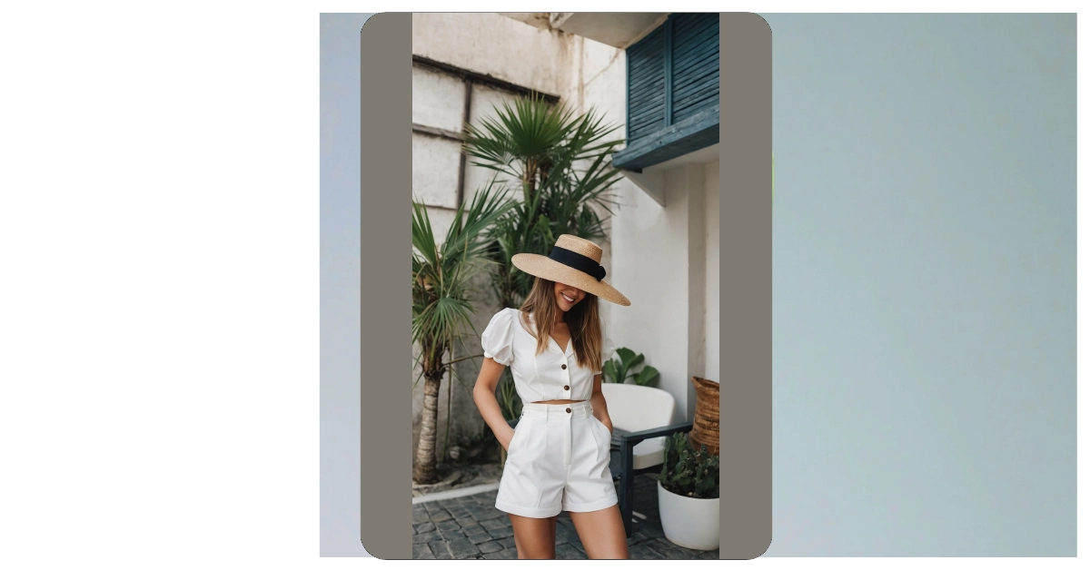 And that all-white outfit? Pure genius for looking effortlessly chic while probably plotting which snack to grab next. Surrounded by those cool palm plants, this balcony looks less like a typical outdoor space and more like a secret, sunny hideout. Imagine chilling there, soaking up the warmth (but not too much sun, thanks to the hat!), and maybe even having a chat with those blue shutters. It’s the perfect spot to feel like you’re on vacation without ever leaving home – just don’t try to hide your entire face from your parents with a hat this big, or they might think you’re avoiding chores!